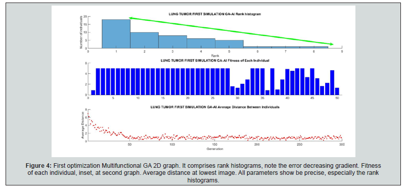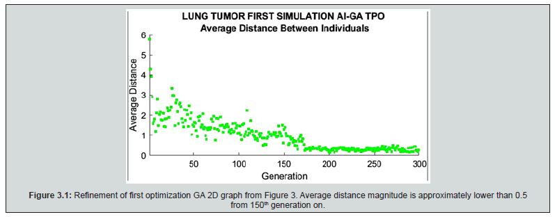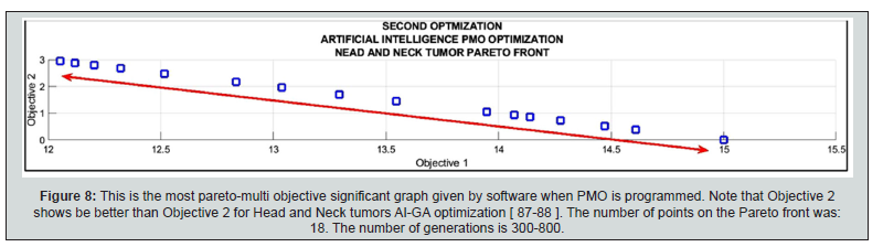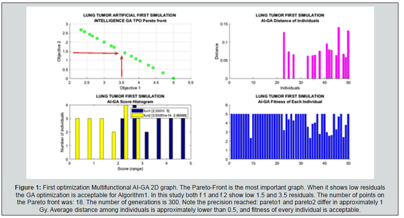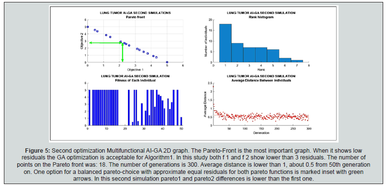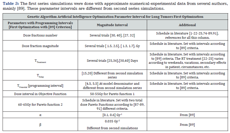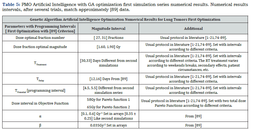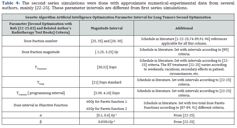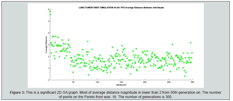 The objectives of the study were graphical and numerical optimization of standard BED model for modern Lung cancer TPO. The method applied was Artificial intelligence with GA Pareto-Multi objective Optimization. It is the same technique from previous research with BED model for Breast and Head and Neck tumors TPO. Optimization was performed according to two authors’ biological BED models criteria [22-25, 87-89,91]. Therefore, it constitutes a step forward to apply GA for Lung cancer TPO advances. The mathematical method applied is Pareto-Multi objective Optimization. The advantage of 2D Multi objective Optimization compared to common one is to obtain at least two pareto functions, and the optimal choice can be got selecting the most convenient data from objective 1 and objective 2 graphs (Figure 1,8,9). Compared to Tikhonov Inverse Optimization method, that was applied in previous publications, that constitutes an advantage [21,75]. However, classical Tikhonov methods can be considered precise and useful. A useful-comprehensive simplification of the GA-PMO method was shown in Table 2. Complementary, and specifically for lung tumors, a Biomarkers Author’s proposal of modern classification based on [101,108,109].
