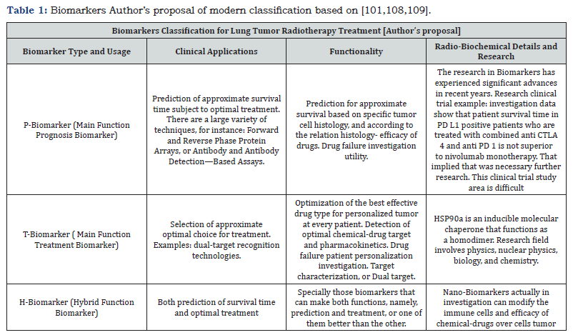 Today, biomarkers are getting an important role in order to predict the survival time, optimal chemotherapy, and both characteristics at the same time. Table 1 shows a biomarkers classification into P-Biomarkers (Biomarkers for Prognosis), T-Biomarkers (Biomarkers for Optimal Treatment), and H-Biomarkers (Hybrid Biomarkers Group). General Biomarkers classification. Nano-Biomarkers is an open research field with potential perspectives in future. Just remark that Biomarkers are is extent, diverse and difficult as involves biochemistry, molecular biology, medicine-pharmacology, medical physiology and several other fields. Therefore, this Table is simple based on Author’s proposal classification. Hence, Biomarkers can be classified into two groups. Namely, T-Biomarkers, those specific for treatment, and P-biomarkers, those specific for prognosis.
