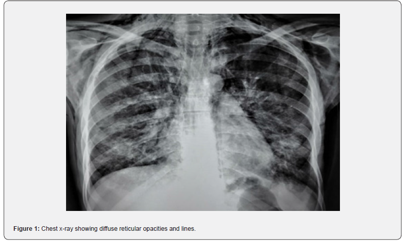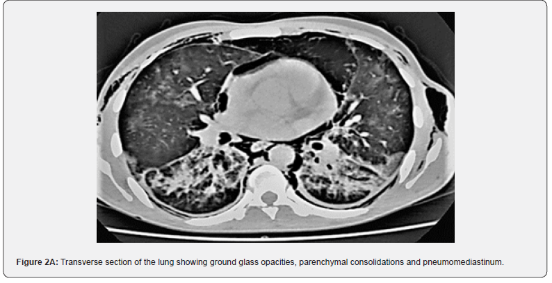 A 30-year-old man was admitted to the emergency room for stage 3 dyspnoea of the MRC classification, with signs of chest muscle tightness, fever at 39° and sweating. After conditioning and stabilizing the patient on the ventilatory level, the physical examination showed crackles on pulmonary auscultation, heart sounds were well perceived, there was no abnormality in the rest of the ‘physical examination. Oxygen saturation was low at 89% in room air. Blood pressure was 110/08mmHg. Chest x-ray showed diffuse nodular opacities in both lung fields as well as reticular lines (Figure 1). Chest CT showed left basal consolidation and scattered ground glass hyper densities in both lungs (Figure 2A and 2B). The biological assessment showed white blood cells at 13,000 e/mm3, a CRP at 100mg/l. A rapid test for positive HIV infection that has been confirmed by serology after patient consent. Normal liver and kidney function.