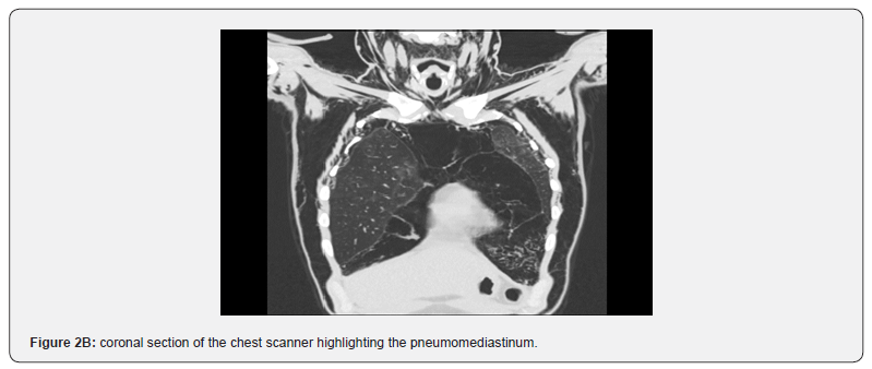 The realization of the thoracic scanner is often necessary especially if the patient presents a chronic pathology, or if there is a suspicion of oesophageal rupture. It shows the pneumomediastinum in a precise way where air is detected over the entire anatomical tract of the mediastinum [16]. Esophageal transit with water-soluble fluids is necessary if there is a suspicion of esophageal rupture, it shows extravasation of the contrast product. The evolution of spontaneous pneumomediastinum is generally towards resorption in 48 to 96 hours by the passage of air into the bloodstream, this passage is accelerated if the patient is put on oxygen thanks to the theory of the diffusion of nitrogen [17]. The management of pneumomediastinum depends on the severity of the clinical presentation and the volume of it on the chest CT scan, as well as possible complications which may be compression of adjacent structures or air infiltration to the different spaces. life-threatening.