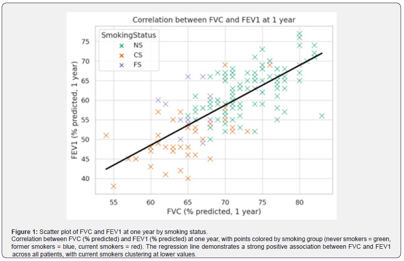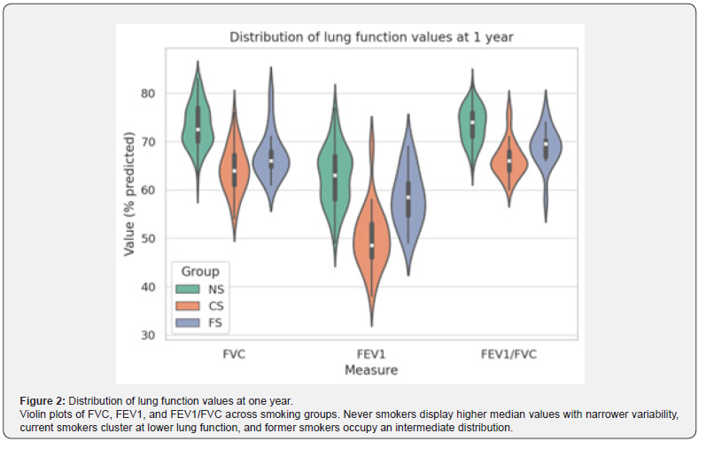 Within-group Friedman tests revealed significant longitudinal improvements in FVC among NS (χ²=13.03, p=0.0015) and CS (χ²=43.95, p<0.001), while FS also improved modestly (χ²=10.84, p=0.004). (Table 3) These data reinforce earlier reports that active smoking accelerates lung function decline and reduces reversibility. (Figure 1) shows the correlation between FVC (% predicted) and FEV1 (% predicted) at one year, with points colored by smoking group (never smokers = green, former smokers = blue, current smokers = red). The regression line demonstrates a strong positive association between FVC and FEV1 across all patients, with current smokers clustering at lower values. (Figure 2) shows violin plots of FVC, FEV1, and FEV1/FVC across smoking groups. Never smokers display higher median values with narrower variability, current smokers cluster at lower lung function, and former smokers occupy an intermediate distribution.