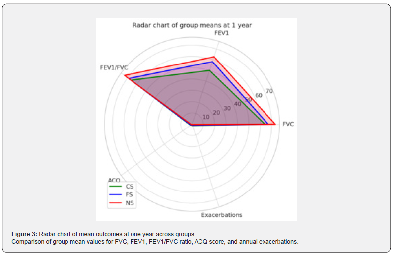 Statistical analysis: Statistical analysis was performed using Statistical Package for Social Sciences (SPSS) version 21 by IBM USA. Categorical variables were presented as numbers and percentages (%) and continuous variables were presented as mean ± SD and median. Because normality is uncertain and the FS group is relatively small (n=16), non-parametric tests were used by default. Between-group differences at each time point: Kruskal-Wallis test, with pairwise Mann-Whitney U tests and Holm adjustment. Within-group change over time (Baseline → 3 months → 1 year) using Friedman test and exacerbations by Kruskal-Wallis with pairwise Mann-Whitney U tests. A p value of < 0.05 was be considered statistically significant.