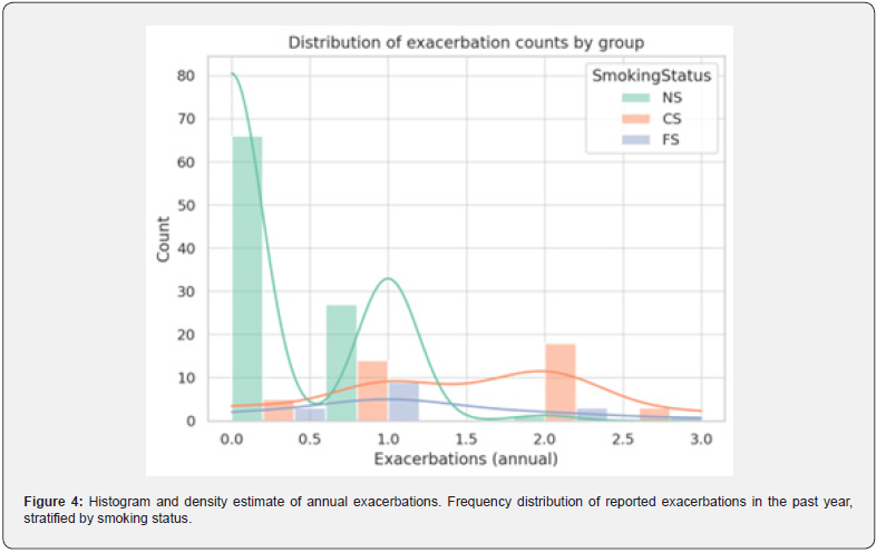 The burden of exacerbations was significantly higher among smokers. CS experienced an average of 2.1±0.42 exacerbations per year, compared to 1.6±0.44 in FS and only 0.8±0.32 in NS. Between-group differences were highly significant (Kruskal-Wallis H=59.65, p<0.001). Post-hoc analysis showed that both FS and CS had significantly more exacerbations than NS (Holm-adjusted p<0.001), while FS and CS did not differ significantly. (Table 3) These findings are in line with published evidence that smoking asthmatics suffer more frequent severe exacerbations, hospital admissions, and corticosteroid requirements. (Figure 3) shows the comparison of group mean values for FVC, FEV1, FEV1/ FVC ratio, ACQ score, and annual exacerbations. Never smokers show the most favorable profile, with higher lung function and better asthma control, while current smokers display the poorest outcomes. Former smokers occupy an intermediate position, indicating partial recovery following cessation. (Figure 4) shows the frequency distribution of reported exacerbations in the past year, stratified by smoking status.