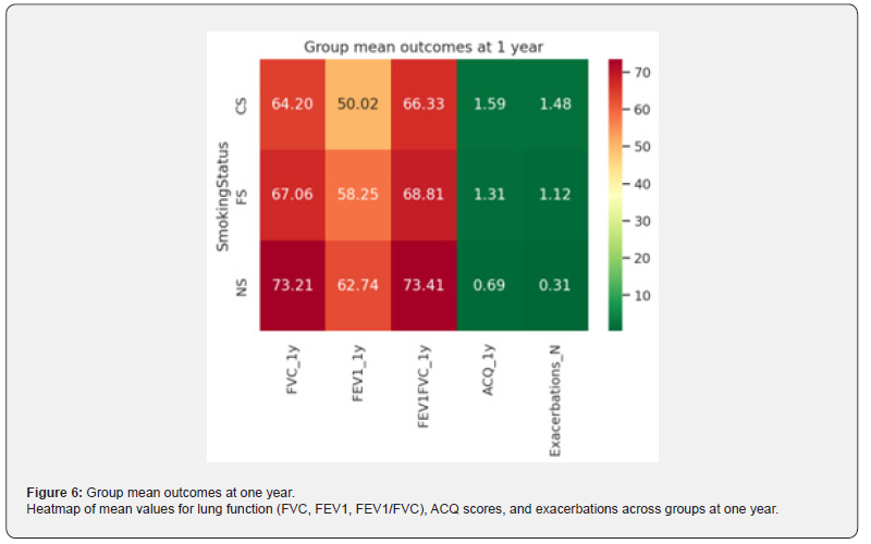 Current smokers have the highest concentration of patients experiencing two or more exacerbations, while never smokers are skewed toward fewer events. (Figure 5) shows the Boxplot illustrating the distribution of annual asthma exacerbations in never smokers (NS), current smokers (CS), and former smokers (FS). Current smokers show the highest median and widest variability, while never smokers report the lowest frequency of exacerbations. (Figure 6) mean outcomes at one year, represented by heatmap of mean values for lung function (FVC, FEV1, FEV1/FVC), ACQ scores, and exacerbations across groups at one year. Never smokers consistently demonstrate the most favorable outcomes, while current smokers show the poorest results, with former smokers in between.
