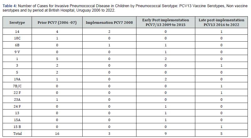 (Table 4) shows the 16 different serotypes isolated from children with IPD, and the number of PCV13 VST and non PCV13 VST by period. After PCV implementation the number of PCV13 VST strains were 15 of 16 (94%), the most frequent were 1, 14, 3 and 5. The non VST isolated was a 23 A serotype. In the year of implementation, the 3 strains were PCV7 VST, two serotype 14 and one 6B. In the early post-implementations period, 6 of the 9 strains were PCV13 VST (one 6B, one 9V, two 1 and one 19A), the other 3 strains were NVST 24 F, 13 and 15 A. For the late postimplementation period, two PCV13 VST were isolated: serotypes 14 and 3, the other three were 7B/C, 22 F, 15 B. A significant reduction of PCV13 VST was observed comparing prior PCV and late implementation periods (p=0.00000000).