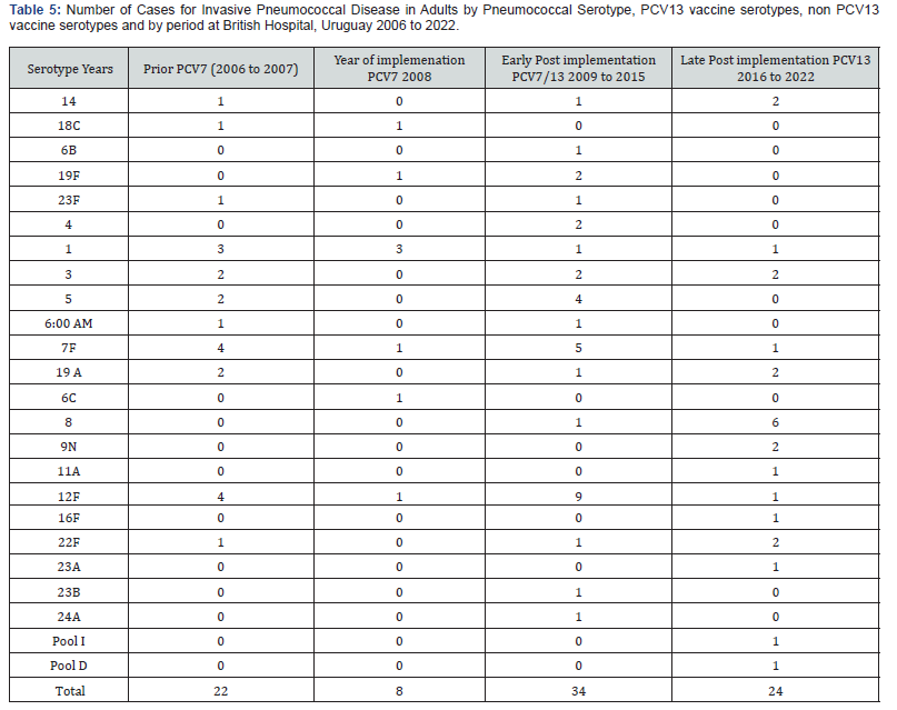 (Table 5) shows the 24 different serotypes isolated from adults. Prior PCV implementation 17/22 (77%) of the strains were PCV13 serotypes; the most frequent were: 1, 5, 3 and 19A. The non-PCV13 ST were 12F (4 strains) and one 22F. The year of implementation, 6/8 strains isolated were PCV13 VST (2 PCV7 and 4 PCV13 serotypes), the two non-PCV13 ST were 6 C and 12F. In the early post-implementations period, 21/34 (61,4%) serotypes were PCV13 serotypes (14, 6B, 19F, 23F, 4, 1, 3, 5, 6A, 7F and 19A), the other 13 strains were non-PCV13 ST, 9 serotype 12 F, one 8, one 22F, one 23 B and one 24 A. For the late postimplementation period, 2/ 24 strains were PCV13 VST (34%), the other 16 strains were NVST, two strains 22 F, six 8, two 9N and 1 strain for each one of following serotypes: 11A, 12F, 16F, 23A, Pool I and Pool D. In adults, a significant reduction of PCV13 VST was also observed comparing prior PCV and late implementation period (p=0.0000002).