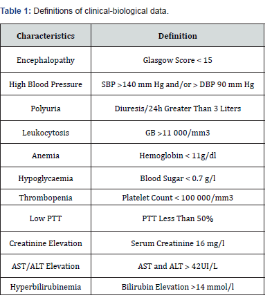 This is a retrospective, descriptive and analytical study over the period of 5 years (January 1st, 2020 to December 31th, 2024) in the obstetric anesthesia-resuscitation department of the university hospital of Marrakech. We included all patients admitted in peripartum in whom the diagnosis of AFLP was suspected or retained on clinical and paraclinical (Swansea) criteria after exclusion from differential diagnoses (HELLP, viral hepatitis, drug-induced hepatitis). We have excluded the incomplete and inoperative medical records. A survey sheet has been preestablished. The data collection was based on patient records and hospitalization and death registers. The maternal epidemiological, clinical, paraclinical, therapeutic and evolutionary data were studied, as well as the fetal prognosis. We used the Microsoft Excel 2016 software for the creation of the database. The quantitative variables were expressed as an average and the qualitative variables were expressed in terms of number and percentage (%). The pathological thresholds of the biological variables of the Swansea criteria were used. The definitions of clinical-biological data are summarized in (Table 1). The statistical analysis was carried out using the Pearson Chi2 test or the exact Fisher test from the Epi Info software version 7.2.2.6. The p value allowing to affirm the existence of a statistically significant difference between two percentages of two variables was set at 0.05.