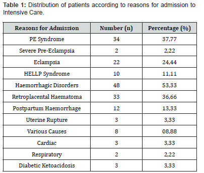 causes of admission were obstetric haemorrhages (53.33%) and hypertensive disorders of pregnancy (37.77%). The main therapeutic