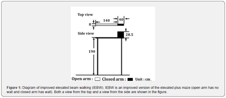 To improve the reproducibility of the experiment with a small sample size, we used the improved elevated equipment (IEBW) diagram to classify the individuality of the rats which consists of an open arm without walls and a closed arm surrounded by acrylic plate walls with a 2 x 4 cm board 190 cm high from the floor [5]. Rats were placed on the tip of the open arm, then allowed to explore the area freely for 3 minutes. Through ANS activity and behavior according to the time spent in the open arm, the rats were divided into two types. L-type rats that stayed in the open arm for a long time (≥60 s) were hypo anxious with lower fear and anxiety toward the height of 190 cm, while S-type rats that stayed in the open arm for a short time (<60 s) were hyper anxious with higher fear and anxiety toward the height. The classified eleven L-type rats were used in this present study (Figure 1).