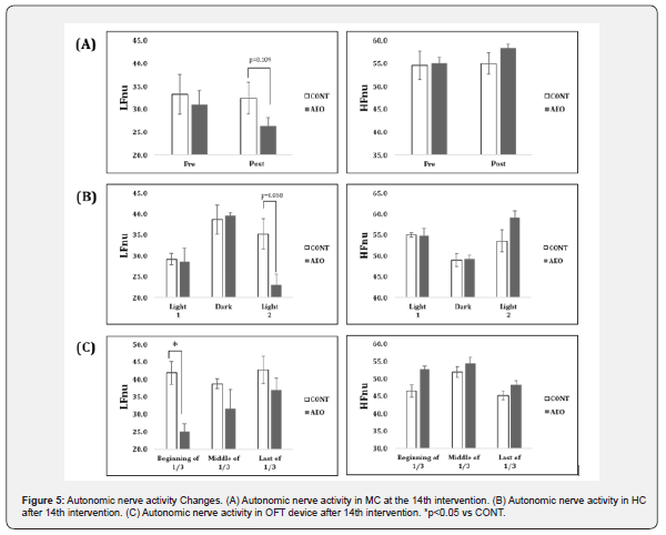 10-minute average autonomic nerve activities based on search actions under the novel environment by OFT was regularly used to evaluate rats’ uneasy states. From detailed analysis of ANS through the divided three portions of 10 minutes, a tendency of LFnu drop and HFnu rise was shown in each section after 14th intervention, especially at the beginning of 1/3 period, AEO rats showed a significant decrease of LFnu than CONT rats (Figure 5C).