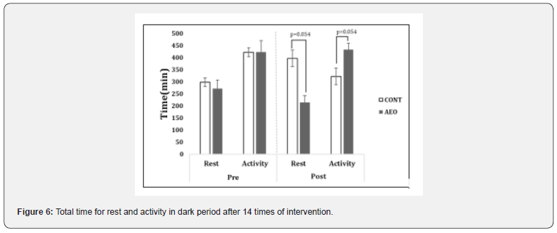 In addition to the actions of rats in metabolic cage by the fragrance revelation, rest state such as sleeping or keeping still with open eyes, as well as activity state like feeding behavior, standing or personal grooming in home cage were observed. After the continuous 14 interventions, rest, and activity quantities during the period of 12 hours (18:00~8:00) in home cage were calculated. At light period, which means the rest time to rats, two groups showed almost the same aspects (data not shown), but at the dark period, which indicates the activity time to rats, AEO rats showed a large decrease of rest time together with an increase of active time (p=0.054) (Figure 6).