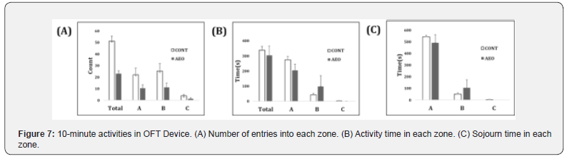 In the open field device, activities were recorded with a video camera to evaluate self-motion in each division and the sojourn time there, which indicates an index of the uneasy state of rats. For the sojourn time, moving time and the number of times to enter into each zone, were not significantly different between the two groups. However, even though there was no difference in total movement time compared with the CONT group, both a longer trend to enter into the intercentral part of B-zone and the sojourn time there was seen in AEO group, which might possibly represent these rats’ some positive and active behaviors with a calm state than CONT rats, because the latter rats were shown more entries into each zone but shorter time where they stayed there (Figure 7).