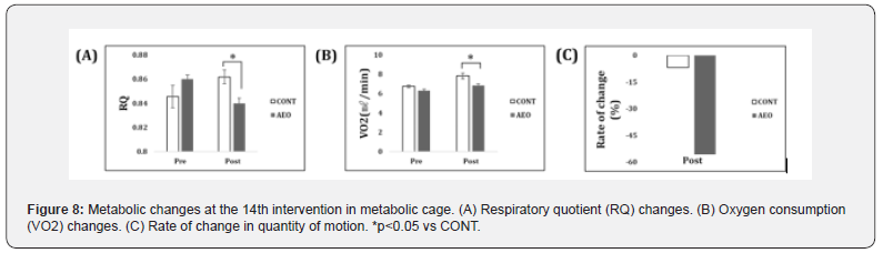 To examine whether the continuous fragrance revelation has influence on energy consumption, we measured respiratory quotient and oxygen consumption at the time of the last intervention in metabolic cage. Concurrently, momentum changes such as eating and grooming actions were also observed, at the last time of intervention, CONT and AEO groups showed -6.8% and -55.8% decreased respectively when compared with pre-study. In accord with the actions in the metabolic cage, AEO (RQ: 0.83, VO2: 6.85) showed a significant decrease in both RQ and VO2 than CONT (RQ: 0.85, VO2: 7.81), whereas there was not a difference before the experiment (Figure 8).