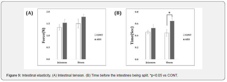 After 2 weeks of AEO conversion and OFT measurement, the rats were killed, and the jejunum and ileum of the small intestine were removed. It was then measured for elasticity using a loaddisplacement measuring unit (KE-FSA-05K2-5N, IMADA, Japan) by means of tension and the time before the bowels being teared.