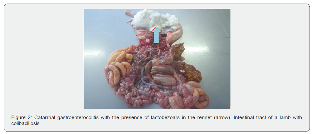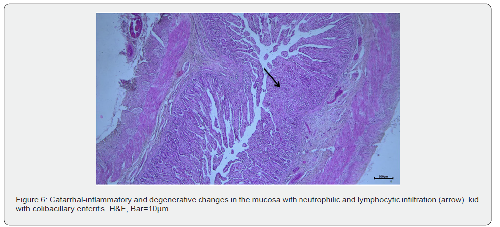 Microscopic lesions in colibacillosis were in the proximal part of the small intestinal tract, expressed by catarrhal-inflammatory and degenerative changes, absence of intestinal villi, neutrophil and lymphocytic infiltration of the mucosa. Authors such as [10] have observed in coli infection in kids and lamb’s superficial desquamation of the villi with degenerative-necrobiotic changes of the epithelial cells, atrophy and fusion of the villi. The small intestine’s lumina was infiltrated with numerous lymphocytes and macrophages. Other authors such as [14] have observed transmural hemorrhages and thrombosis of the vessels in the rennet of lambs. In contrast, we [15] observed hemorrhagic abomasitis in goats with colibacillosis. Microscopic changes in the rennet were vascular hyperemia, mucosal hemorrhages, goblet cell hyperplasia, and infiltration of lymphocytes and plasma cells.