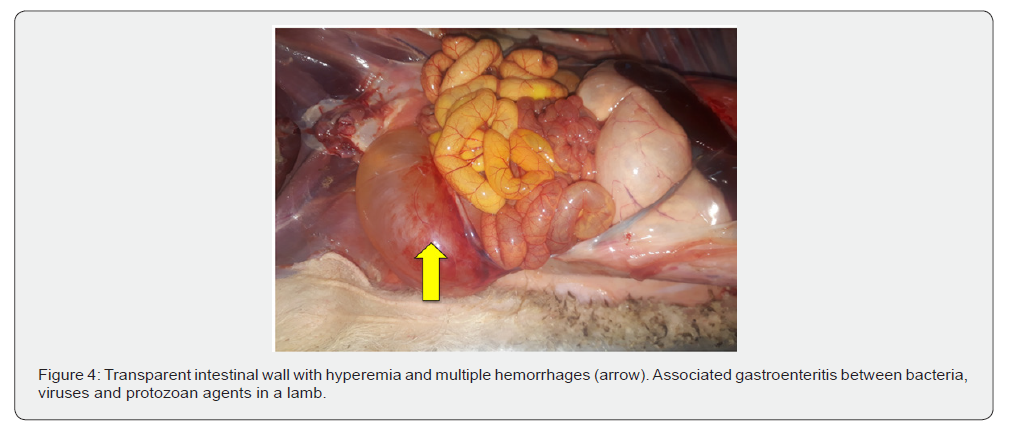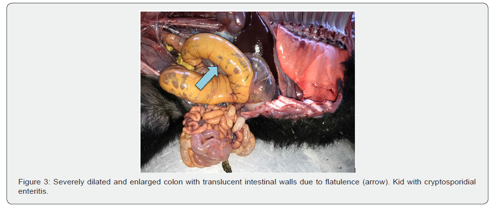 A characteristic pathological finding in viral enteritis in kids and lambs was catarrhal enteritis to enterocolitis in cases of coronavirus infection. Similar to ours are the results of the studies [10], which reflect changes in the intestine and lung in lambs with corona and rotavirus enteritis. In contrast to viral and protozoal enteritis in colibacillosis, we found catarrhal gastroenteritis in three lambs and gastroenterocolitis with lactobezoars in the rennet and thrombosed umbilical vessels. In the lungs, similar to coronavirus enteritis, single pneumonic foci were observed. Endocardial hemorrhages and bicuspid valve hematomas were present. In cases of cryptosporidial enteritis, the intestinal contents were yellowish mixed with blood and mucus, as well as flatulence in the large intestine. Similar lesions were not observed in other intestinal infections. These results are partially consistent with our previous studies on gastrointestinal diseases in newborn and growing calves [11-13], as well as with the results of other authors working in the field of gastrointestinal pathology [4,14].