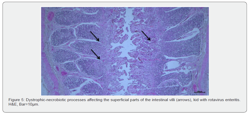 From the histopathological examination of different segments of the gastrointestinal tract of lambs and kids with rotavirus enteritis. Microscopic changes were most drastic in the jejunum and ileum. They were expressed in dystrophic-necrobiotic processes in the superficial parts of the intestinal villi (Figure 5). Individual crypts were filled with desquamated epithelial cells and exudate. There was also submucosal and intermuscular edema with glandular hypersecretion. The propria was infiltrated with numerous lymphocytes.