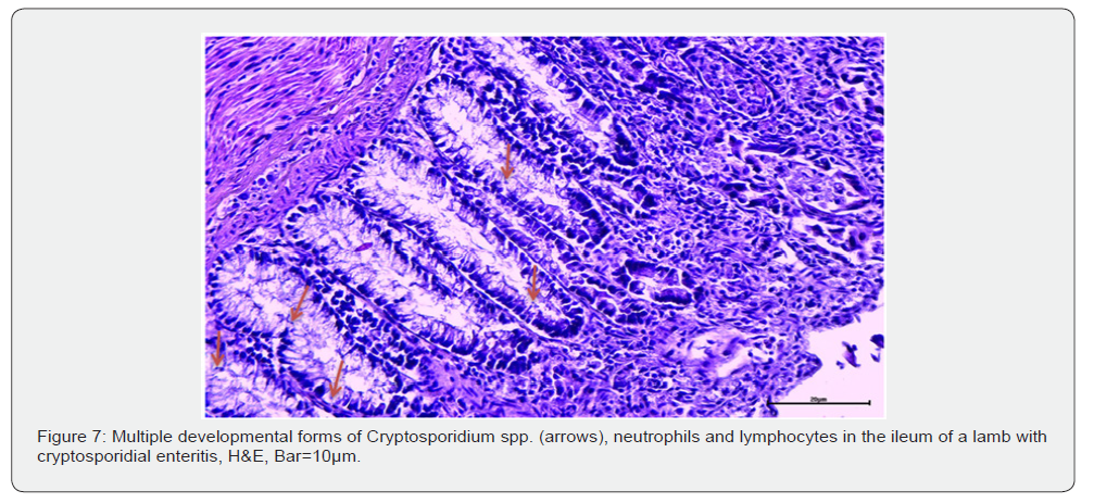 Unlike viral and bacterial enteritis, cases of cryptosporidiosis, enteritis have superficial desquamative catarrh of the small and large intestines with atrophy and fusion of some of the intestinal villi. There was infiltration by neutrophils in the mucosa and submucosa. Multiple developmental forms of the causative agent Cryptosporidium parvum were observed in the jejunum and ileum. According to data from [16] studies in calves with C. parvum prove that the infection also affects the jejunum and ileum. In our previous [6] studies in lambs with coccidiosis and cryptosporidiosis, we have observed villous atrophy in the ileum and colon, as well as multiple developmental forms of Cryptosporidium spp. and Eimeria spp. on and in intestinal epithelial cells. According to [3], coinfections involving viral and bacterial agents together with cryptosporidia increase the severity of intestinal macro and microlesions in individual segments. Neutrophilic infiltrates have been observed in the mesenteric lymph nodes of lambs and kids.
