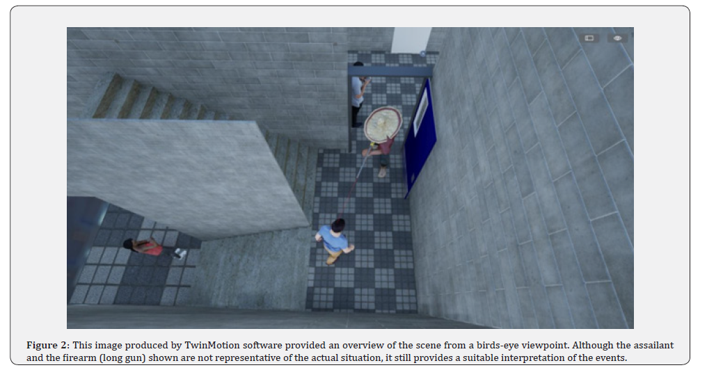 Developing the AR scenario was quite straightforward which involved searching through the library of 3D media assets to locate the appropriate items such as the staircases and doorway, cutout of the building on an upper floor, and selecting individuals to represent the shooter, victim and others presented in the witness testimony narrative. This process of dragging and dropping items into the virtual environment was simple as well as moving and placing the assets in different locations throughout the scene. The whole process of creating the visualization based on the witness statement once the digital assets were selected extended approximately 3 hours from start to finish, with much of that time spent on getting used to the controls and functionality of the software. Note that the assets provided in the TwinMotion library do not allow for customary changes in clothing, hence the shooter in this example is not representative of the assassin in the narrative. Additionally, certain assets provided are stagnant and cannot be manipulated in terms of positioning, adjusting facial expressions, or modifying items in possession (i.e.: placing a firearm in the hand of 3D model) (Figure 2-7).
