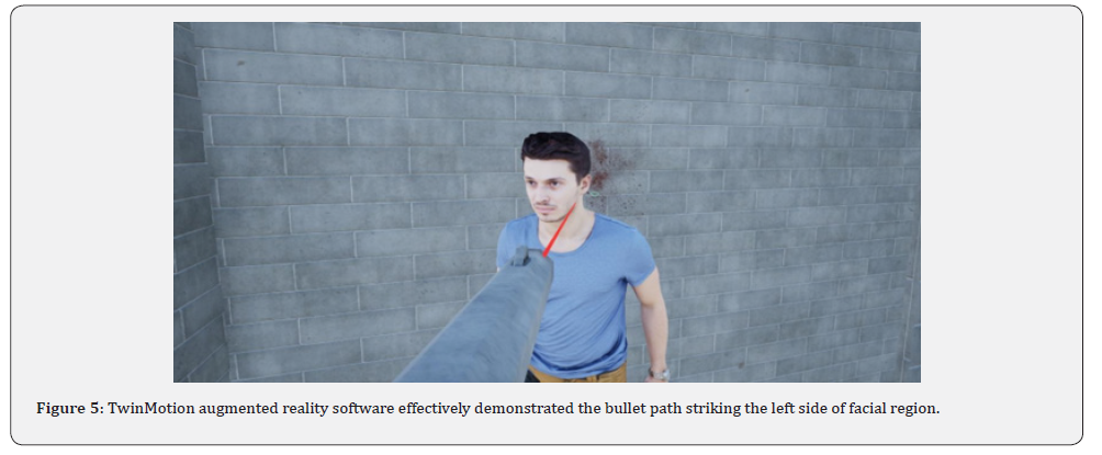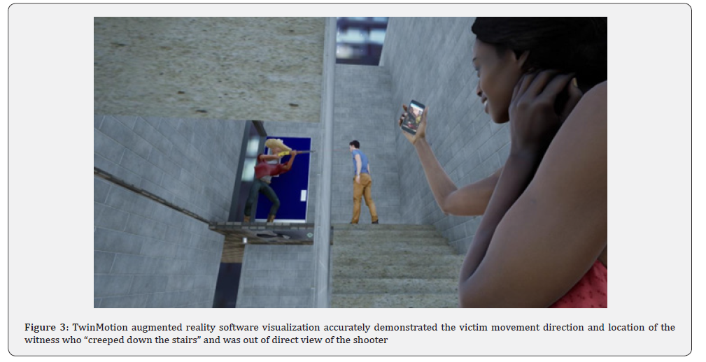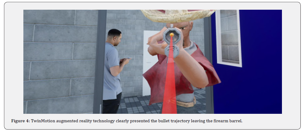 Implementation of AR can greatly benefit crime-scene reconstruction through the visualization of the witness narrative to demonstrate the series of events leading up to the violent outcome. Providing an accurate representation of the victim in relation to the perpetrator of the crime, in this case, the shooter that killed the individual, can offer a crucial element to criminal investigators and courtroom attorneys without the need for expensive software or physical simulation environments and technically savvy experts to utilize the system. The TwinMotion software proved to be exceptionally simple in terms of functionality and depicted the sequence of events accurately and in a fashion that anyone could quickly understand to what occurred. It successfully demonstrated the trajectory reconstruction of the projectile path and shooter-to-victim positioning. There are some limitations to this technology that can directly affect the AR trajectory workflow, such as alteration or misalignment in overlays. These can undermine measurement credibility and the inability to offer exact quantitative measurements for evidential defensibility. Furthermore, the digital assets in this case produced an imperfect 3D model which were not representative of the described shooter and weapon used in the murder. Overall, the transformative potential of AR in providing forensic investigators with a tool to visualize and manipulate evidence while enhancing collaboration will have enormous value in the future use in crime scene investigations through the leveraging of immersive technologies.