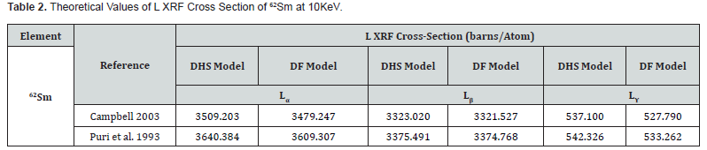 Several earlier studies have reported experimental and theoretical L X-ray production cross-sections for rare earth elements including samarium, such as those by Silhadi et al. [11], Miranda et al. [12], and Bansal et al. [13], which provide valuable data for comparison and validation of the present results. Comparing the results obtained using DHS and DF models allows evaluation of the sensitivity of theoretical LXRF cross-sections to the choice of atomic models and highlights any systematic deviations between the two approaches. The calculated data obtained in this study represents a new set of theoretical LXRF production cross-sections for samarium (62Sm) at 10 keV excitation energy. These values are expected to serve as a useful reference for experimental studies, aid in improving the accuracy of quantitative energy dispersive X-ray fluorescence (EDXRF) analysis and contribute to the refinement of fundamental atomic parameter databases used in various spectroscopic applications.