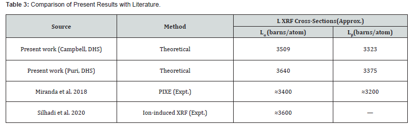 The comparison of Campbell and Puri datasets also reveals a systematic difference in the predicted cross-sections as shown in Table 3. The use of Puri’s parameters leads to slightly higher values than Campbell’s, which can be directly correlated with the higher f13 and f23 probabilities in Puri’s dataset that enhance the transfer of vacancies into the L3 subshell, resulting in stronger Lα and Lβ intensities. The difference between Campbell and Puri sets is about 3.7% for Lα , 1.5% for Lβ , and about 1% for Lγ . This observation highlights the sensitivity of the calculated LXRF cross-sections to the choice of fundamental atomic parameters, especially the CK transition probabilities.
