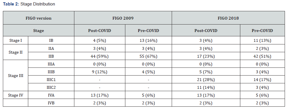 Based on FIGO 2009, more patients presented with earlier stage (I/II) cervical cancer pre-COVID as opposed to post- COVID (87% and 67%, respectively), as shown in (Table 2). After applying the FIGO 2018 system, stage I/II distribution at diagnosis dropped to 67% and 31%, respectively. The presence of nodal involvement, as depicted by the FIGO 2019 IIIC category, was doubled in the post-COVID cohort (42%) compared with the pre-COVID cohort (21%). In addition, the proportion of patients with stage IVA disease was almost three times as high post-COVID (17% versus 6%). A small number of patients with IVB cervical cancer were included as they had small volume bony metastases or peritoneal involvement limited to the pelvis. Overall, there was a statistically significant pattern of stage migration post-COVID (see Supplementary Table 1).