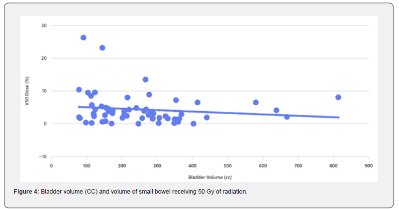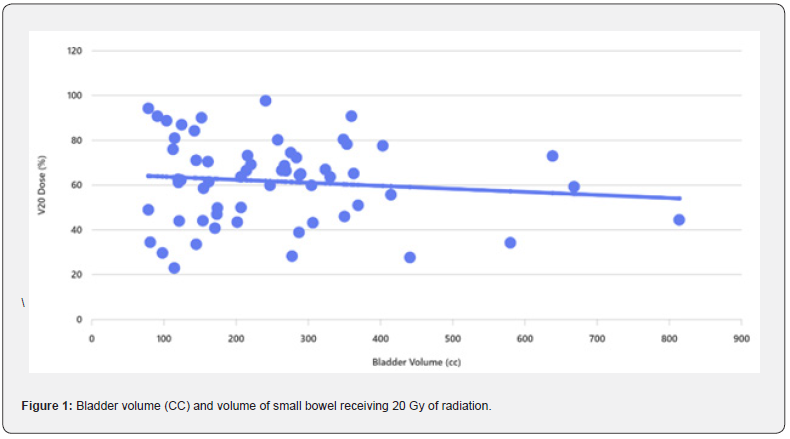 A waiver of authorization was obtained from the Institutional Review Board, and clinical data of 60 prostate cancer patients treated with radiotherapy in 2016 at our institution were retrospectively reviewed. All patients had tissue diagnoses of prostate adenocarcinoma, confirmed by cytologic or pathologic review at our institution. All cases were identified with medical record number (MRN). Data was collected using a combination of an electronic database, case notes. Radiation records were obtained for all patients from Eclipse treatment planning system (Eclipse TPS). We collected information on bladder and small bowel volumes, small bowel volume which received 20 Gy (V20), 30 Gy (V30), 40 Gy (V40) and 50 Gy (V50). The minimum dose to the PTV was 95% of the prescribed dose (7400 cGy in 32 fractions). Patients are asked to empty their bladder then drink 3 cups of water within 5 minutes. They hold this in the bladder for at least 30 minutes until the planning scan is complete. Patients who have a catheter were excluded from the study. Patients who had prostatectomy were also excluded. All patients were scanned with a full bladder on supine position. PTV and OAR including small bowel which were countered by 6 different consultant clinical oncologists to reflect day to day practice. Small bowel was contoured as bowel bag. Radiotherapy plans were generated using Intensity-Modulated Radiation Therapy (IMRT). Bladder volumes, dose volume histograms (DVHs) V20, V30, V40 and V50 for small intestine were obtained for each patient. We ran the Spearman’s rho correlation coefficient to measure the strength of the linear relationship between the bladder volume and the dose to the small bowel. we used partial correlation coefficients controlling for small bowel volume.