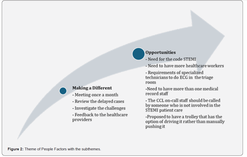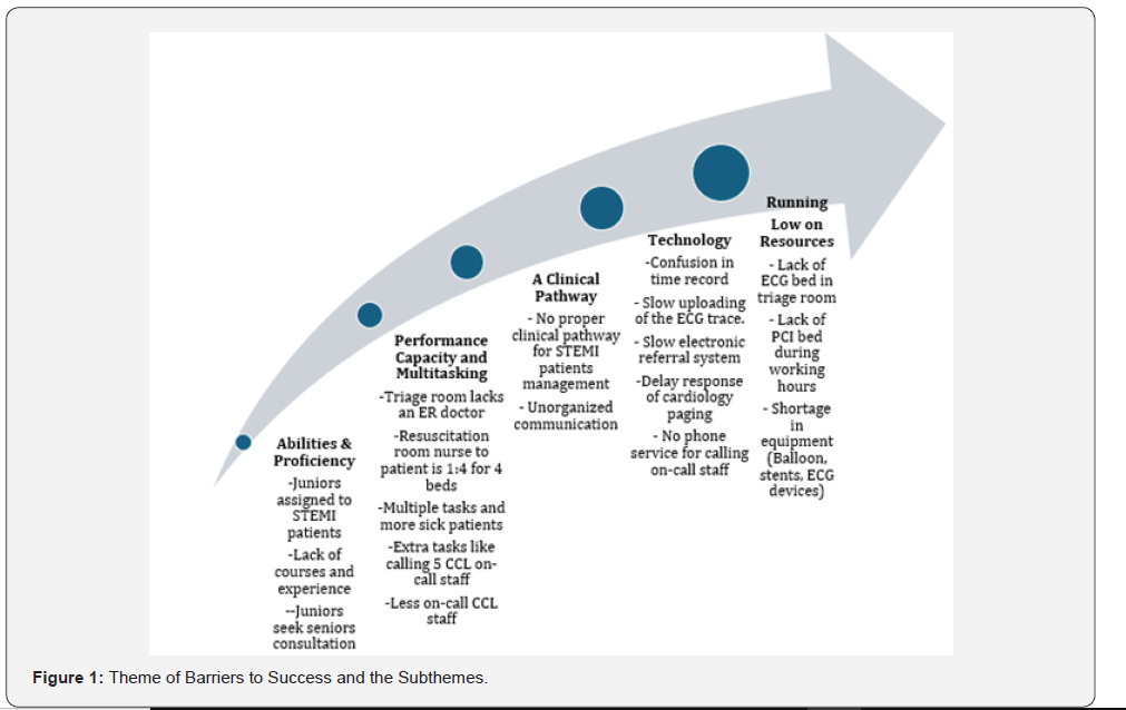 Individual Interviews were conducted with a total of 10 staff from ER and CCL as outlined in Table 2. The findings included three main themes which encompass challenges and barriers in STEMI management. The three themes were Barriers to Success, People Factors, and Quality Improvement. Each theme had subthemes illustrated in Table 3: