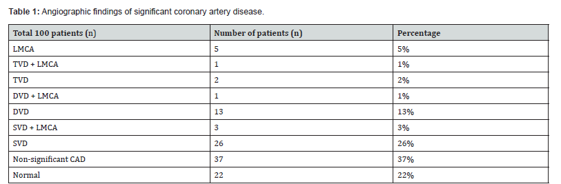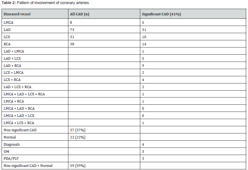 Left anterior descending artery was most affected vessel (31 patients out of 41 patients with significant CAD, 76%), followed by right coronary artery in 14 patients (36%) and left circumflex artery in 10 patients (24%). Significant CAD was noted in 41 patients (41%), non-significant CAD in 37 patients (37%) and normal coronaries in 22 patients (22%). Abu Tareq Iqbal et al. [36] study group had higher percentage of normal coronaries (64%) compared to current study group (22%) [36]. This could be because of lesser comorbidity burden in their group. They had DM in 19 patients (25%), dyslipedemia in 16 patients (21.33%), obesity in 8 patients (10.6%) and hypertension in 26 patients (34.66%) as against 39 patients (39%), 38 patients (38%), 24 patients (24%) and 75 patients (75%) in current study group [36].