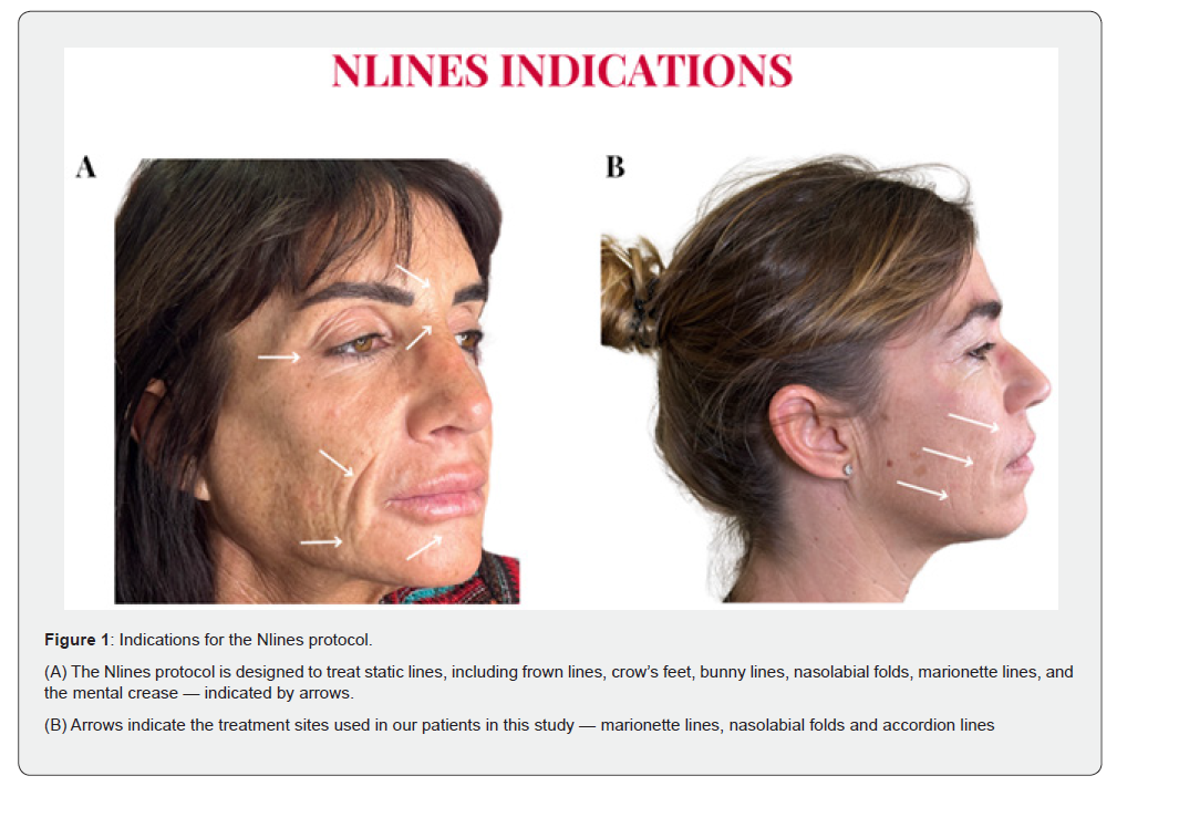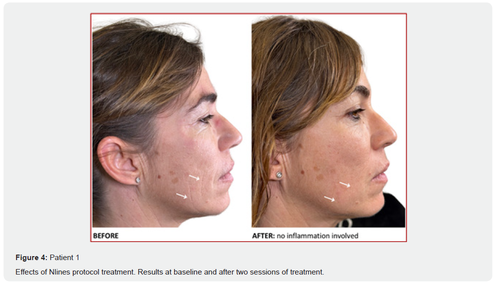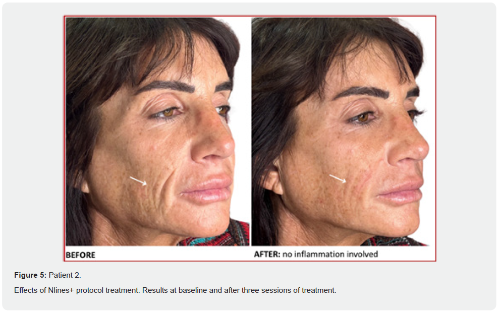 Both completed 2–3 treatment sessions at 1–2-month intervals, targeting the marionette lines, nasolabial folds and accordion lines. No complications occurred, with only mild, transient erythema reported. Patients described an immediate “glow effect” after treatment, followed by progressive improvements over several weeks, including reduced wrinkles, refined pores, enhanced texture, and increased firmness. These results were consistent across different ages and baseline severities. The findings suggest that the Nlines protocol is a safe, well-tolerated, and effective approach for perioral rejuvenation, offering both immediate and long-lasting improvements in skin quality.