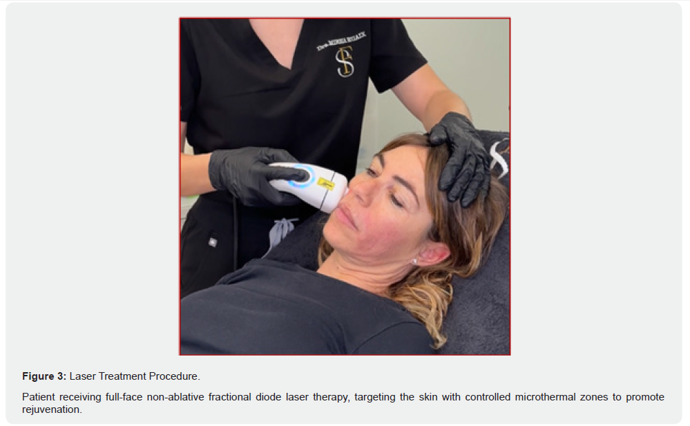 Over subsequent weeks, non-ablative fractional laser treatment creates microscopic thermal zones in the dermis, initiating a wound-healing cascade that increases collagen types I and III, as well as elastin fibers [17,19,22,23]. Concurrently, the filler maintains structural support, minimizing wrinkle reformation during collagen remodeling [24,25]. The addition of glycine and L-proline-key amino acids involved in collagen synthesis - further amplifies the skin-rejuvenating effects of the treatment [26-28.] This synergy could explain the sustained improvement in texture, firmness, and skin tone observed in our patients. Comparable results have been reported in studies combining HA with non-ablative erbium glass or diode lasers, which showed superior patient satisfaction compared to either modality alone [10,11].