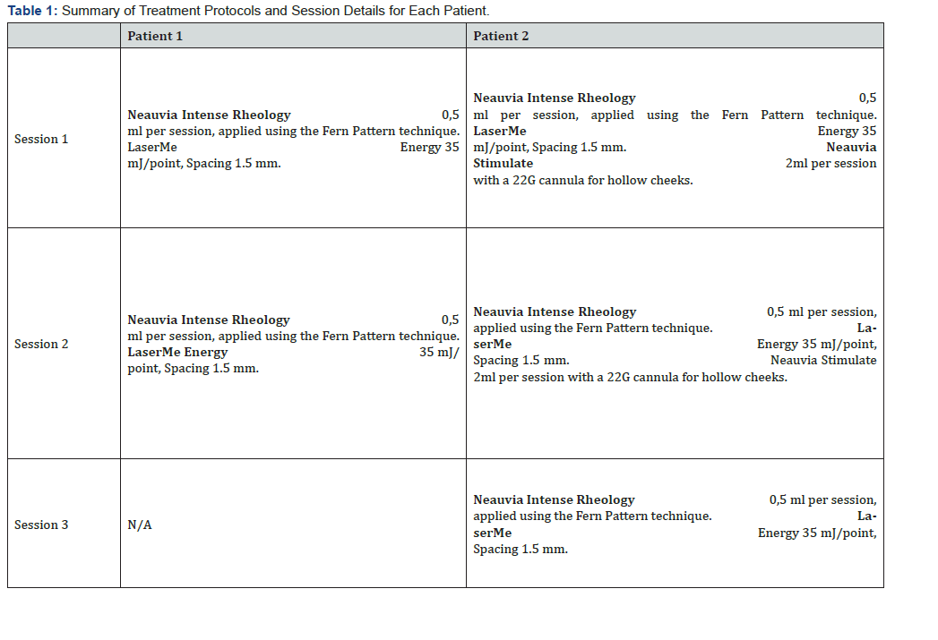 Both patients adhered to a post-treatment care protocol consisting of sun avoidance, daily use of a broad-spectrum sunscreen, avoidance of acids and retinoids for one week, and application of a restorative moisturizer (such as a ceramide shield) to support skin barrier recovery. Follow-up assessments were performed at 4 weeks, coinciding with the next treatment session.