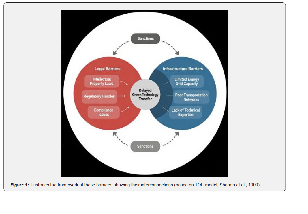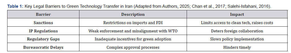 Amid rising climate change concerns, adopting green technologies for product production is vital for nations pursuing sustainability [14]. Green product production entails manufacturing processes that reduce environmental impact via renewable energy, waste minimization, and eco-friendly materials [15]. For Iran, endowed with abundant natural resources but facing issues like water scarcity, air pollution, and soil degradation, the transfer of such technologies could drive a greener economy [16,17]. However, legal and infrastructural barriers substantially obstruct this progress [18,19]. Iran’s adherence to global accords such as the Paris Agreement and its national development plans prioritize greenhouse gas reduction and renewable energy promotion [20]. Yet, advancement is sluggish; recent data show Iran’s renewable energy capacity at merely 1% of its total energy mix, well below global norms [21,22]. This delay stems from complex barriers, including international sanctions that curb technology imports and domestic infrastructures unsuited for innovation [23,9]. This paper provides a comprehensive analysis of these barriers, emphasizing legal elements like IP laws, regulatory frameworks, and sanctions, as well as infrastructural challenges Such as energy instability and logistical shortcomings [24,25]. Its novelty integrates post-sanction developments from 2020-2025 and proposes an original framework merging institutional reforms with technology localization [3,7]. The structure includes a literature review, methodology, barrier analysis with tables and figures, discussion, recommendations, and conclusion.