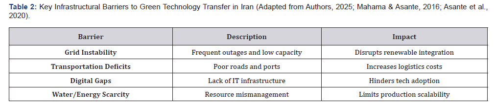 How to cite this article: Mohammad Taleghani1* and Mohammadreza Jabreilzadeh Sola. Analysis of Legal and Infrastructural Barriers to the Transfer of New Technologies for Green Product Production in Iran. Juniper Online Journal of Public Health, 6(1). 555679.DOI: 10.19080/JOJHA.2025.06.555679.