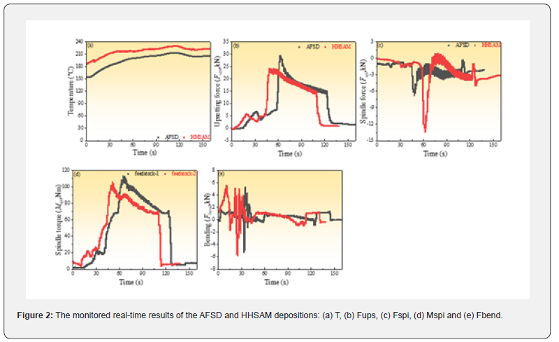 Figure 1b presents images of the obtained AFSD and HHSAM depositions, and Figure 1c illustrates the sampling diagram based on the fabricated deposition. Both depositions exhibited excellent forming quality without visible flaws. The detailed differences in microstructure and properties are discussed below in conjunction with the in-situ process monitoring data. Post fabrication, depositions underwent heat treatment in a vacuum annealing furnace (NB380A, Normantherm, China). The heat treatment included solution treatment at 535 ℃ for 2h, water quenching, aging at 175 ℃ for 8h, followed by air cooling. The solution treatment ramp rate was 8.5℃/min, with the quenching water temperature at approximately 25℃. Hereafter, specimens are designated as AFSD and HHSAM depositions, respectively.