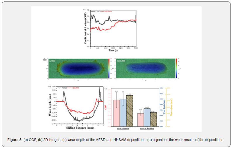 Figure 5a presents the COF evolution for each specimen during wear testing. In these tests, the deposition surface contacts the 440C counter face, and interlocking asperities at the junction elevate friction. This raises the force required to overcome static friction, causing a sudden COF increase during the static‐to kinetic friction transition, after which COF stabilizes near 1800s for all specimens. The HHSAM deposition exhibits a stable COF of 0.72±0.14 compared to 1.45±0.42 for AFSD deposition. 3D optical profilometry of the worn regions Figure 6 reveals maximum wear depths of 0.100±0.023μm and 0.066±0.001μm for AFSD and HHSAM, respectively. Moreover, the HHSAM worn surface displays a slight groove, indicating that its structural density limits plastic deformation during wear and reduces abrasive wear. Conversely, the AFSD worn scar exhibits severe plastic deformation with plowing marks parallel to the sliding direction. As listed in Table 3, HHSAM deposition demonstrates superior mechanical properties that enhance wear resistance. The homogeneous microstructure and increased tensile strength restricted plastic strain and extended service life before reaching the critical strain threshold for fracture [29]. The wear volume of the specimens, depicted in Figure 6, indicated that the HHSAM deposition exhibited a lower volume (0.044±0.001mm3), 0.33 times that of the AFSD deposition (0.066±0.001 mm3). This finding demonstrates that HHSAM provided superior wear resistance by inhibiting crack nucleation and surface-parallel propagation, thereby mitigating delamination [30]. Additional heating improved flow, mixing, and distribution of the deposits during HHSAM, resulting in enhanced structural density and wear resistance.