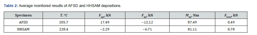 From Figure 3c presents Fspi, the resultant force along BD. It comprises the positive friction force (“+BD”) from the advancing feedstock and the negative drag force exerted by the softened material on the spindle (“−BD”). When the hollow tool pressed firmly against the deposited layer, the interface restricted plastic deformation, compressing it to a fixed thickness and inducing an upward reaction force that imposed positive pressure on the spindle. At the feedstock tip, plastic deformation generated a substantial static friction force against the inner wall of the hollow tool head as the material expanded and deformed. As the feedstock moved downward, the hollow tool experienced a downward drag force while the spindle encountered a negative tensile force. These combined factors influenced the evolution of Fspi. For AFSD specimens, the heat was insufficient to soften the feedstock fully, resulting in limited plastic deformation and a lower Fspi (−6.71kN). By contrast, during HHSAM deposition the feedstock tip experienced elevated temperatures, increasing its susceptibility to plastic deformation and enhancing its flow. Consequently, the negative drag force predominated, yielding an Fspi of −12.12kN for the HHSAM specimen Table 2. Moreover, the HHSAM deposition exhibits a lower Mspi (81.11Nm) and higher Fbend (0.78kN) than the AFSD deposition (87.49Nm and 0.49kN). Induction heating thoroughly softens the feedstock and enhances material flow. Simultaneously, it reduces the viscosity and strain rate of the material, which ultimately decreases Mspi Table 2 [23]. The improved flow behavior of the HHSAM specimen increases Fbend.