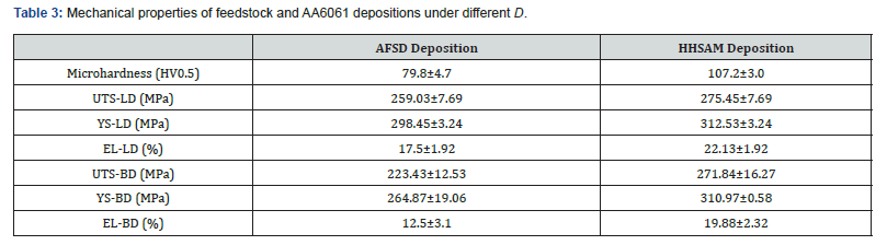 Similarly, the tensile properties along the BD also improved substantially. The UTS, YS, and EL of the HHSAM samples reached 271.84±16.27 MPa, 310.97±0.58 MPa, and 19.88±2.32 %, respectively, compared with the AFSD deposition, which produced 223.43±12.53 MPa, 264.87±19.06 MPa, and 12.5±3.1%. This enhancement primarily resulted from grain refinement. AA6061 is a precipitate-hardening alloy, and the induced precipitates positively affect mechanical properties [26]. Thus, the deposition enhancement may also stem from precipitate strengthening. Consistent with the research of [27] the induced Mg2Si and β″ phases significantly increased hardness by effectively restraining dislocation movement [27]. As noted in the discussion and our previous research [9], Al (Fe, Mn) Si was present in the HHSAM deposition, acting as obstacles to dislocations and yielding higher tensile strength. Notably, the EL enhancement in the HHSAM deposition indicates improved ductility and bonding strength, primarily attributed to grain refinement, which accommodated additional dislocations and enhanced the capacity of the material for plastic deformation evolution [28]. These results confirm that HHSAM effectively enhances softened material fluidity during fabrication, increases bonding strength between deposited layers, and thus improves structural density, uniformity, and mechanical properties of deposited components along BD.
