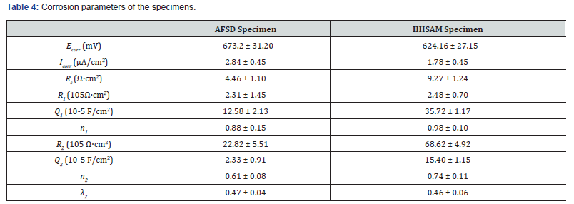 Figure 6a presents the corrosion behavior of AFSD and HHSAM depositions immersed in a 3.5wt% NaCl solution, with corresponding electrochemical parameters (corrosion potential (Ecorr) and corrosion current density (Icorr)) listed in Table 3. The slightly more negative Ecorr of the AFSD deposition (−673.2±31.20 mV), compared to HHSAM (−624.16±27.15mV), suggests that Sc addition increased the tendency for corrosion initiation; however, it did not govern corrosion kinetics. HHSAM exhibited a significantly lower Icorr (1.78±0.45μA/cm2) than AFSD (2.84±0.45μA/cm2), indicating enhanced corrosion resistance. The manufacturing process plays a crucial role in refining deposition microstructure, with Icorr decreasing proportionally as grain size reduces [31]. The refined grain structure of the HHSAM deposition enhanced formation of a more protective oxide layer and resulted in a lower Icorr [32]. Precipitates within the deposition acted as barriers against chloride ion diffusion, further slowing the corrosion process [33]. The Nyquist and Bode plots in Figure 6 were analyzed with an equivalent circuit, and fitted results are summarized in Table 4, where Rs denotes the solution resistance, R1 and Q1 represent the resistance and capacitance of the induced passive film, respectively, R2 indicates the charge transfer resistance, and Q2 denotes the double layer capacitance. Notably, the Nyquist plot in Figure 6 revealed that the HHSAM deposition exhibited a larger capacitive arc diameter than the AFSD specimen, indicating improved protection against corrosive media degradation. This finding aligns with the PD result and was further corroborated by R1. The Rf value of the HHSAM deposition (2.48±0.70 ×105Ω·cm2) exceeded that of the AFSD specimen (2.31±1.45×105 Ω·cm2), confirming that the induced passive film on the HHSAM deposition provided enhanced resistance and corrosion protection, thus reducing the overall corrosion rate. The observed improvement is attributed to the formation of a more stable and compact oxide layer, rendering the material less susceptible to corrosion. The HHSAM deposition exhibited a slightly higher R2 value (68.62±4.92 × 105 Ω·cm2), indicating enhanced corrosion resistance [34]. The micro-galvanic effect induced by particles did not influence the HHSAM deposition; rather, the improved corrosion resistance relative to the AFSD specimen was primarily attributable to the refined microstructure and formation of a more protective passive film.