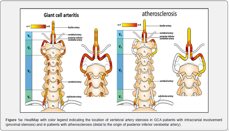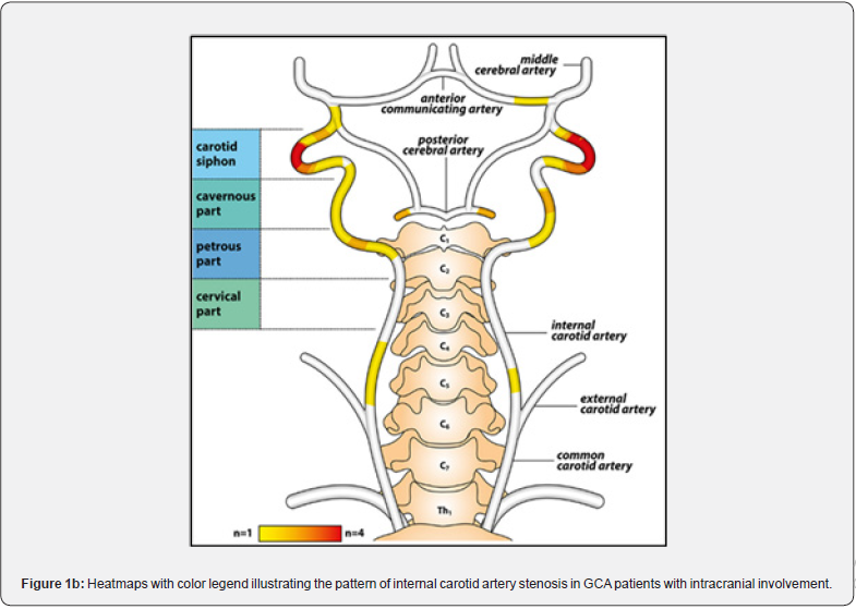 Strokes most commonly involving the vertebrobasilar system, although carotid arteries may be involved. Internal carotid artery (ICA)-involvement has been reported before as a rare but characteristic pattern in GCA, especially in the petrous and cavernous segments. The first reported case of a patient with GCA, presenting both intracranial/extradural ICA involvement, was reported by Oerding C and al (2020). Heatmaps of carotid artery involvement showed predominantly bilateral stenosis located within the carotid siphon in GCA patients (Figure 1b). Remarkably, the disease can affect both distal vertebral and internal carotid arteries in a very limited number of cases, with varying clinical presentations [42].
