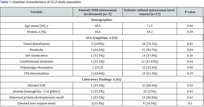 The baseline characteristics of the study population are shown in Table 1. We included 3 patients who developed stroke at the same time they presented with GCA symptoms and 37 patients with GCA without intracranial involvement. The median time from symptom onset until diagnosis of GCA was 5 days and did not differ between patients with and without involvement of intracranial arteries. Demographic characteristics did not differ between these two groups. The most frequent symptoms at the time of GCA presentation in patients with cerebrovascular accidents (CVA) were new-onset headache (66.6%), alteration of visual acuity (100%), jaw claudication (33.3%), STA abnormalities (66.6%), constitutional syndrome (33.3%). Polymyalgia rheumatica symptoms were present in 33% of patients. CVA was more frequent in patients with visual involvement (P = 0.02), especially permanent VL. The CVA occurred shortly after the ocular symptoms (median 2.0 days), and the patients with intracranial involvement less frequently presented with elevated ESR (33.3%).