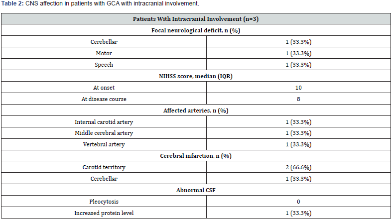 In patients with GCA with intracranial involvement, focal neurological deficits due to intracranial vasculitis at disease onset mainly consisted of motor (33.3%), speech (33.3%) and cerebellar (33.3%) deficits (table 2). Of 3 patients with GCA with intracranial involvement, neuroimaging showed supratentorial ischemic strokes in 2 (66.6%) patients and infratentorial ischemic stroke in 1 patient (33.3%). Brain magnetic resonance imaging (MRI) performed demonstrated schemic stroke in the territory of the internal carotid artery in 1 patient, middle cerebral artery in one patient, explaining the motor deficit found, and ischemic stroke in the vertebrobasilar territory (cerebellar stroke) in a one patient. Intracranial angiographic imaging modalities used included magnetic resonance angiography and computed tomography angiography (CTA). The most frequently affected arteries were the internal carotid artery (ICA; 33.3%), the vertebral artery (33.3%) and the middle cerebral artery (33.3%) (Table 2). The patient with cerebellar infarction had bilateral vertebral artery stenosis. Abnormal CSF was found in 1 (33.3%) patient including increased total protein.