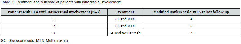 Treatment and outcome information of patients with GCA with intracranial involvement (n=3) included in the study are depicted (Table 3).