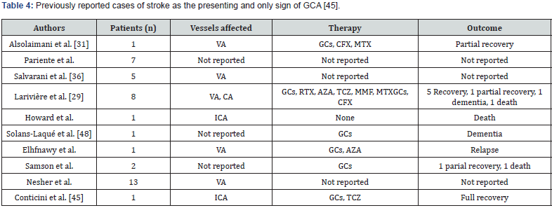 In a low percentage of cases, stroke may represent the only symptom at onset of GCA. A CVA as the only presenting symptom of GCA is an even more unusual finding (Table 5), with poor prognosis and scarce response to therapy. It is directly related to the inflammatory involvement of the internal arotid arteries (ICA), vertebral arteries (VA), and more seldom intracranial arteries, and is an uncommon manifestation of GCA, particularly feared due to the poor prognosis and severe morbidity. In a study of 98 patients with GCA complicated by CVAs, CVAs represented the initial presentation in 5 out of 68 biopsy-proven cases. Furthermore, in a more recent French multicentric retrospective study , stroke or TIA was found in 18 out of 129 (16%) patients affected by GCA, but only 7 of them suffered from an ischemic event at diagnosis, the other 11 occurring within a year after GCA diagnosis [37-40].