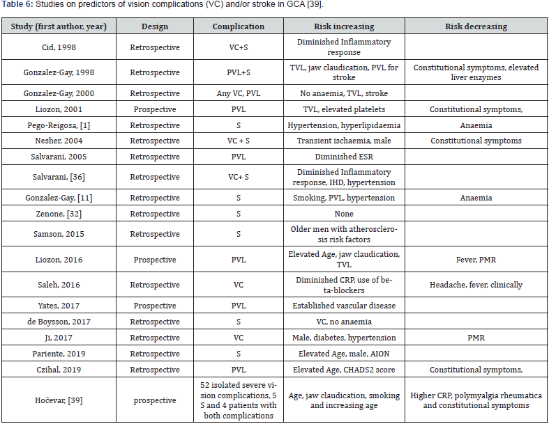 - Soriano A, Muratore F, Pipitone N, Boiardi L, Cimino L, et al. (2017) Visual loss and other cranial ischaemic complications in giant cell arteritis. Nat Rev Rheumatol 13(8): 476-484.