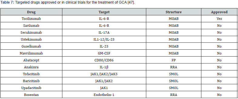 Of particular interest are therapies aimed at inhibiting vascular remodeling. Since GM-CSF appears to be crucial in the destruction of media by macrophages and is involved in the genesis of intimal hyperplasia and neovascularization, its blockade with the specific monoclonal antibody mavrilimumab seems to be an attractive therapeutic option. Instead, studies are underway on bosentan, an endothelin-1 receptor antagonist. This substance produced by vascular endothelial cells is a potent vasoconstrictor and is involved in the vascular remodeling of GCA [45,47] Figure 2 and table 7 show the targeted drugs currently approved or under study that inhibit the various factors involved in the pathogenesis of GCA.