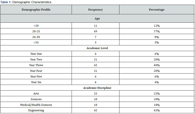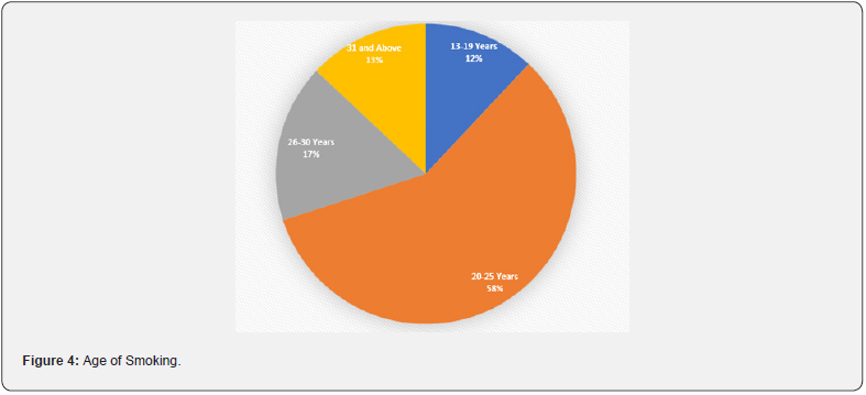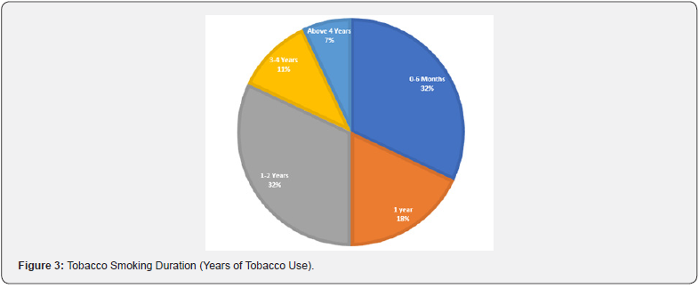 This study was conducted to examine the tobacco smoking patterns among students at the Niger Delta University. This study collected data from different genders, age ranges, academic levels, and academic disciplines. The results for the demographic characteristics presented in Table 1 suggest that most of the participants were in their mid-twenties (20-25 years), while a majority of 40% were om their third year (300 level). As regards their academic discipline many of the tobacco users were in the faculty of engineering (42%). A majority of 89% of the participants were males, while 11% were females. In this survey, the gender of the respondents did not affect knowledge and patterns of tobacco usage. In contrast, Itanyi et al. [6] reported that there were more male smokers and that males had better knowledge levels. The higher percentage of males could be due to the social acceptance of smoking among males, a sense of maturity (a symbol of masculinity), and peer influence. The lower prevalence of female smokers could be due to family values, cultural norms, or religion [6]. In contrast to gender, respondents’ age and the time they started using tobacco products influenced their knowledge. Older respondents had better knowledge, as did those who started smoking later, probably because they had more time to become informed and were aware of more advertisements about the harmful effects of smoking.
