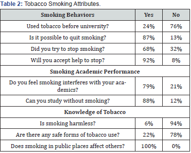 The use of tobacco is predominant in males but also common in female students. Most of the students who are active smokers started smoking during their university education and it is more common among students of the faculty of engineering which may be attributed to peer pressure and academic stress. The use of tobacco was admitted affecting academic performance significantly. However, the motivation to stop smoking is little among the students, Hence, the high rate of student smokers [11-45].