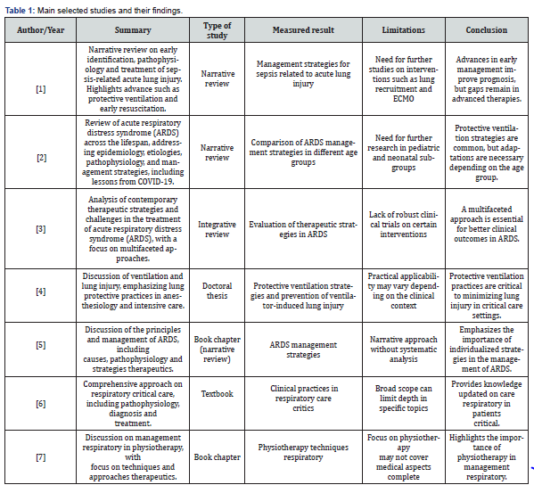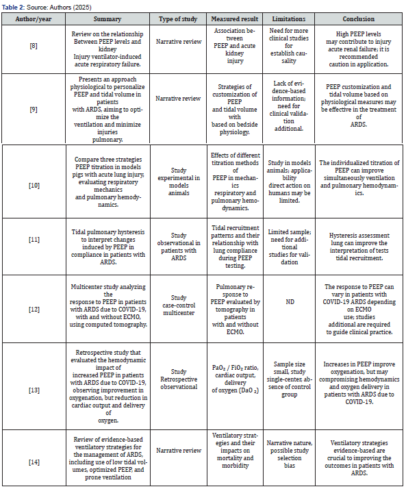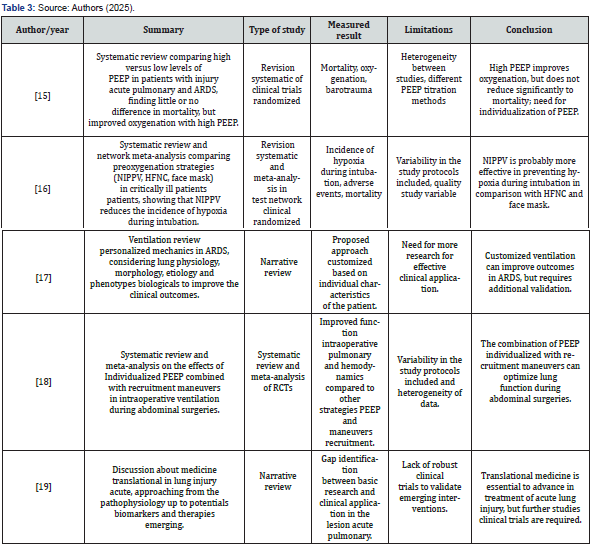 Articles were excluded if they were reports, banners, or conference abstracts. There was no review of confidential health information and the study was not interventional. Therefore, ethics committee approval was not required. In the end, the result obtained totaled 19 articles that contemplated the desired characteristics for the study. Four independent researchers extracted data from articles that met the inclusion criteria and entered them into a Microsoft Excel-generated “data extraction form” on the effects of positive end-expiratory pressure in severe acute respiratory syndrome. From this form, the authors and year of publication, study abstract, study type, outcome measure, limitations, and conclusions of the main studies selected were included, as shown in (Table 1-3).